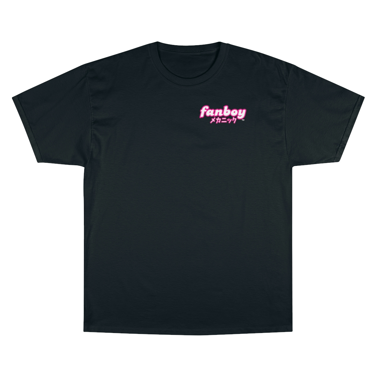 Fanboy garage custom, high-quality T-shirts, small front logo, and large GTR with an RB26/ Waifu mechanic art on the back.